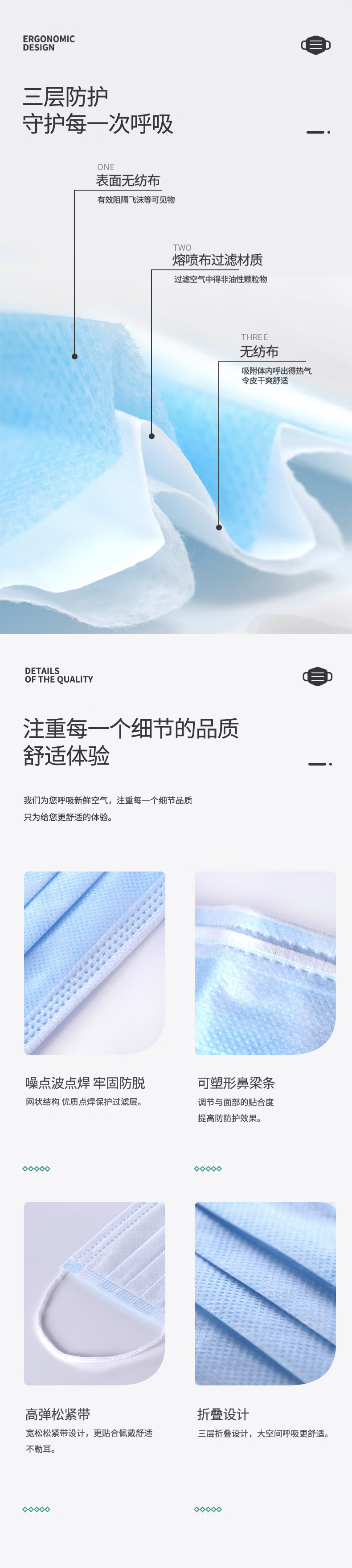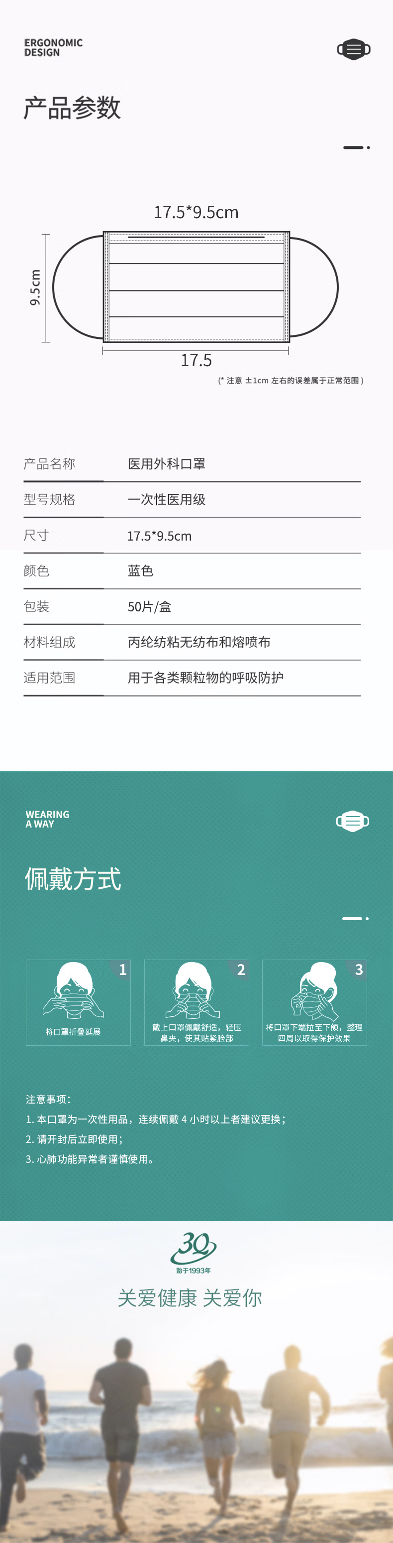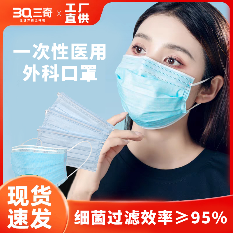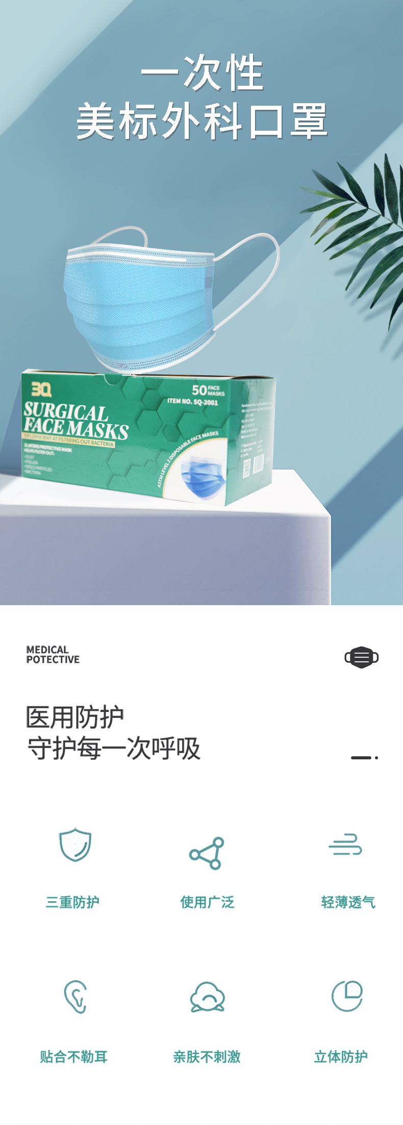 3Q 美标医用外科口罩 Level2 耳挂 非无菌 17.5*9.5cm 50片/盒